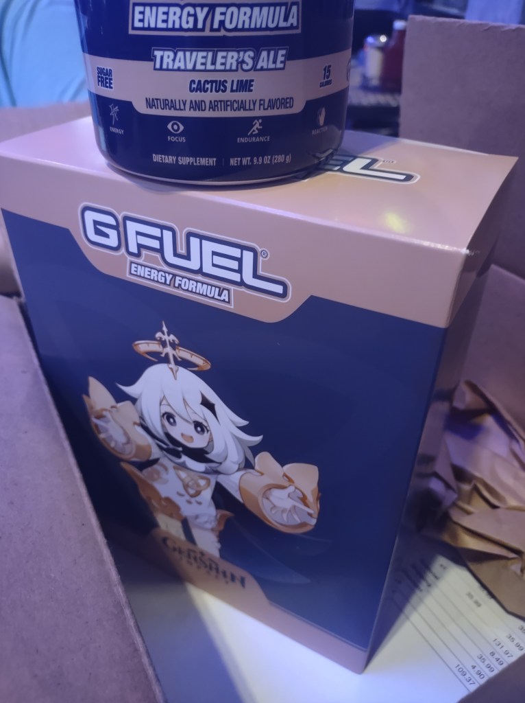 Here we have some more G-Fuel reviews from yours truly. today we have the Traveler’s Ale inspired by Genshin Impact. It is a cactus lime flavor and I have had the privilege of purchasing a collector’s box. The collector’s box came with a tub of the cactus lime flavor and a nice looking stainless steel shaker with Paimon decorating it. Initially I was wary about tasting it because I don’t know what cactus tastes like, but a friend of mine gave me a bit of perspective by relating it to aloe vera. With that mindset I was all aboard giving it a try since the scent of the lime itself was pleasing. It was very refreshing, not tasting too sweet or sour. A very underrated mixture of flavors that work well when you didn’t think it would.