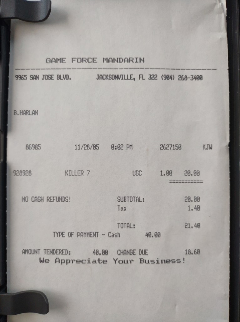 I bought a copy of Killer7 for the GameCube as a gift for a friend and I was met with a giant rush of nostalgia when I went to check it out. When I bought it ($60 btw,) I went to look inside and make sure that all of the stuff was there and that everything was in good condition. What I did not expect to find was an old receipt that tells the story of almost 18 years ago. The game was originally sold in a local mom & pop store and it’s funny to think that it’s still in Jacksonville which was where I did not live until 2006. Cool shit, and also neat knowing that even in 2005, someone wanted this game.