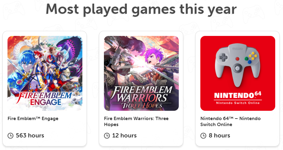 Damn this year went by quickly, or at least I think it did. Looking back, I really did enjoy the time I had with Engage and the first quarter of the year was really fun. Engage came out in the asscrack of January this year so most of my playtime was on February and March. I strictly remember my trip to New York earlier this year and all I had to play was my Switch and my phone (RIP Princess Connect,) so that explains the huge surge of gameplay time during those months. To note, I did play Super Mario Wonder and Warioware Move It, but it was cooperative and on a friend’s account, so most of that data is under his account. Anywho, I wonder how 2024 is gonna hold up because that’s gonna be 7 years in the Switch’s lifespan and I’m ready to go big again next year. Hopefully. Scary to think that the Switch has been around for this long and isn’t showing any signs of stopping at all. I don’t really buy into the Switch 2 hype but I can understand those who do, because the hardware is really starting to show its age. For me, however, it’s not that much of a big deal so whatever happens, let it happen.