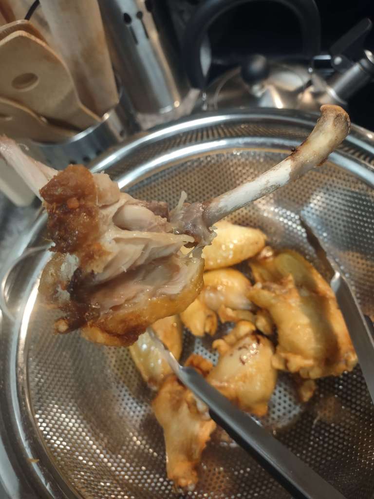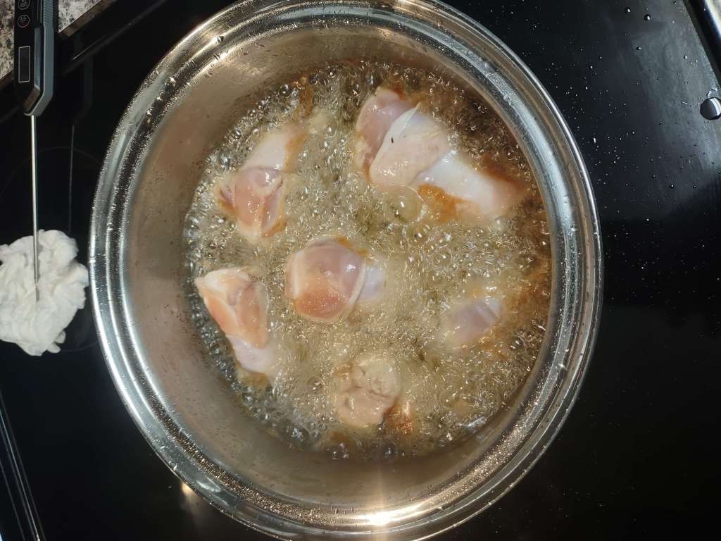 Oh right, gallery view is a thing. Anywho, I decided to fry some frozen chicken wings I got from a sale at a store that was doing a two for one special on a bag of frozen chicken wings. I prepped by just leaving them in the fridge for two days so they wouldn’t be frozen, then I started getting the vessel ready — a big pot. I had some shortening that I used and seeing that small can of solid stuff expand into a decent amount of liquid to fry is an interesting sight. I do wish I had a deeper vessel because shit started splattering everywhere and it was annoying to clean up. I did try to keep the temperature around 350F but in all honesty, I didn’t really bother that much and just went by time really. At least I didn’t do every single wing at once and only went in five to seven wing batches. After I made sure the wings were cooked fully via a thermometer, I put them in a separate strainer so they could continue cooking through carryover cooking.
