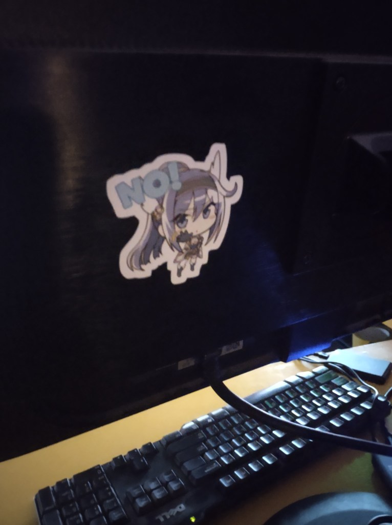 I had one of the stickers that I printed out. I put one on the back of my car and then I had a smaller one which I never used until now. At a certain location people like to put stickers on certain machines just to add some kind of personality to the location and I decide to put my own mark there. I would say it is a bit exhilarating to be able to have first dims of putting something down before most other regular people have the chance to do so. I also had a sticker for Rin and Kokkoro and I followed suit with those as well by putting them in certain places so hopefully the next time I get to that place they will still be there up and running. Stickers are just really cool, man. Also I fucking hope they don’t peel off because I’m probably not the best person to apply stickers even though I didn’t do the little card trick in order to flatten it so there are no air bubbles stuck between the sticker and the surface that it is stuck on.