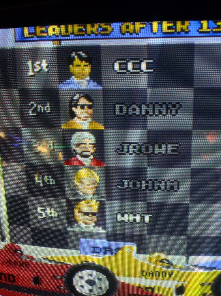I am playing this game at the arcade and is one of the most infuriating things I have ever played because of the design of how you play it. So you cannot play as yellow because yellow is always reserved for Danny and since he is the mascot of the set game he cheats if you are playing with just one person. He has insane rubber banding and will just bullshit his way through the entire race no matter what you do and he scales up to how much you increase your own stats as well. Even when you try to destroy his car he will recover instantly and still get a lot of speed even though his car is on fire so it makes no fucking sense and it really makes me very angry but I did find the magical solution is to just put in another credit and have another player go in because if the second player does not move Danny will sandbag and try to make it so that it’s fair while the other guy just drives normally and wins all the time. Talk about cheating the cheater.