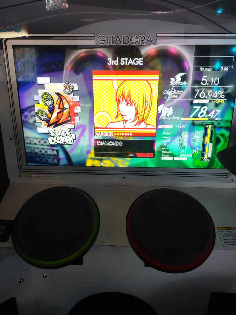 I’ve been grinding out on the drums of Gitadora recently, and it’s nice to be able to see myself progressing bit by bit. The 4.65 is one of my favorite songs by Butaotome, and I won’t lie, I felt like I would fuck up the combo near the end, but I pulled through. The other song, Diamonds, was a song that just fucking killed me the first few times I played it, since it had a lot to do with incorporating constant drumming while also using the pedal in sync with all the hand movements. The moment things “clicked” for me and I realized I knew what to do — that’s one of the best feelings of clarity you can have, and it just makes me excited to see myself improve more and more in the future.